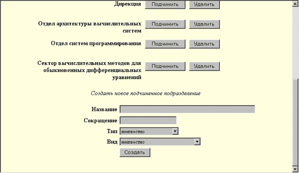 Для создания нового подразделения необходимо ввести в форме, находящейся в нижней части страницы (Рис. 2), название подразделения, сокращенное название подразделения (если есть), выбрать тип и вид. После нажатия на кнопку "Создать" происходит создание нового подразделения и его автоматическое подчинение текущему подразделению. Выдается сообщение "Подразделение создано" и название нового подразделения появляется в списке подчиненных подразделений. По ссылке "Изменить" около названия подразделения, можно перейти на страницу редактирования этого подразделения. Таким образом, сразу же после создания нового подразделения можно ввести все необходимые сведения о нем (телефон, адрес электронной почты, описание деятельности и т.д.).