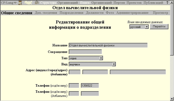 Первый раздел (Рис. 1) предназначен для редактирования общих сведений о подразделении - названия, сокращения, адреса, телефона, факса, адреса электронной почты, адресов WWW- и FTP-страниц. Раздел содержит следующие поля: