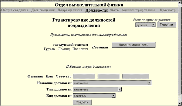 Этот раздел позволяет создать новую должность в текущем подразделении (и связать с этой должностью некоторую персону), а также удалить должность в текущем подразделении.