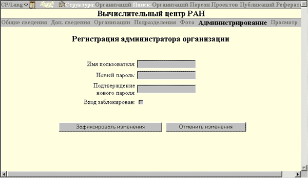 Для регистрации администратора необходимо заполнить перечисленные поля и нажать кнопку "Зафиксировать изменения". При этом производится регистрация администратора в системе, а пользователю предъявляется страница изменения учетной записи (Рис. 2)