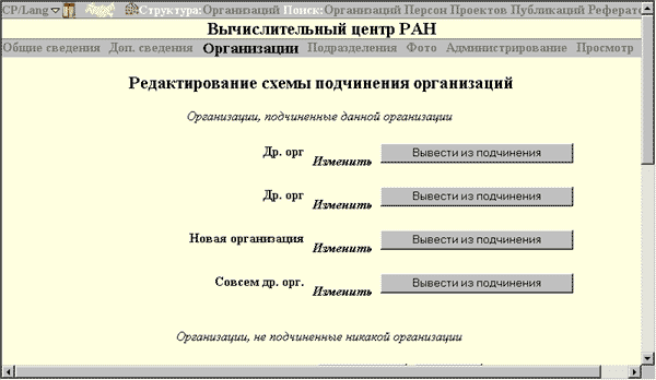 После нажатия кнопки "Удалить" (Рис. 2) происходит удаление никому не подчиненной организации. Таким образом, удалить можно только никому не подчиненную организацию; если же нужно удалить организацию, подчиненную кому-то, необходимо сначала вывести ее из подчинения.
