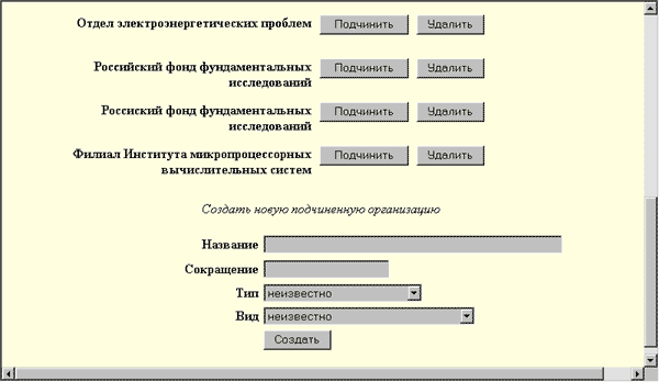 Для создания новой организации необходимо ввести в форме, находящейся в нижней части страницы (Рис. 2), название организации, сокращенное название организации (если есть), выбрать ее тип и вид. После нажатия на кнопку "Создать" происходит создание новой организации и ее автоматическое подчинение текущей. Выдается сообщение "Организация создана" и название новой организации появляется в списке подчиненных организаций. По ссылке "Изменить" около названия организации можно перейти на страницу редактирования этой организации. Таким образом, сразу же после создания новой организации можно ввести все необходимые сведения о ней (телефон, адрес электронной почты, описание деятельности и т.д.).