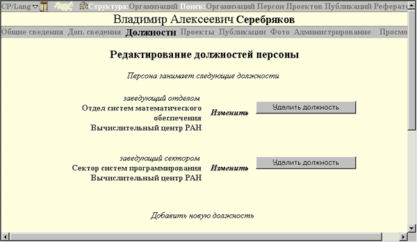 Третий раздел (Рис. 1) позволяет создавать новую должность для текущей персоны (в некотором подразделении некоторой организации), а также удалять должность текущей персоны.