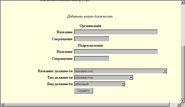 Для создания новой должности необходимо ввести в форме, находящейся в нижней части страницы (Рис. 2), название или сокращение организации, название или сокращение подразделения, выбрать название, вид и тип должности.