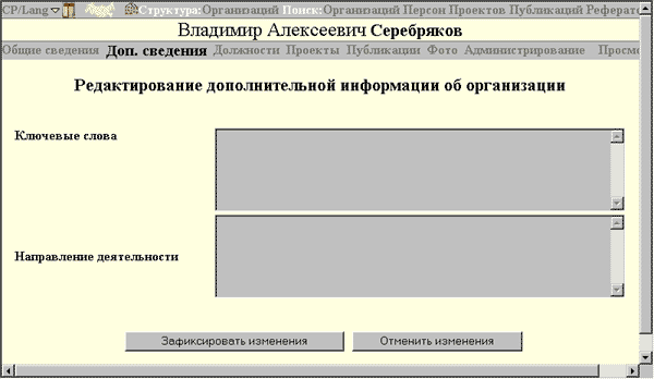 - Направления деятельности. Это поле содержит текст, позволяющий получить общее представление о научной деятельности и научных интересах персоны. Здесь может быть даны, например, краткая биография человека, описание тематики научных исследований, в которых он принимает участие, описание полученных им научных результатов и т.д.