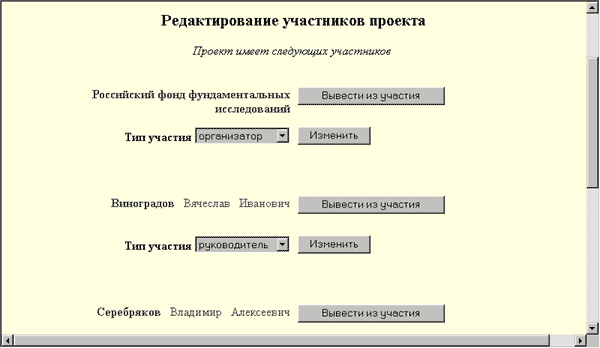 Третий раздел (Рис. 1) предназначен для редактирования списка участников проекта. В начале страницы перечисляются все участники проекта с указанием: