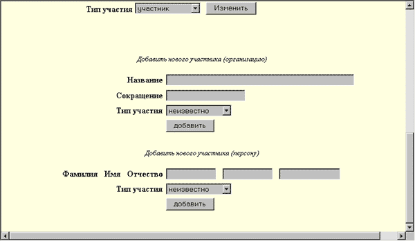 Поле "Тип участия" позволяет изменить тип участия данной персоны или организации в проекте (организатор, руководитель, участник, ответственный и т.д.)