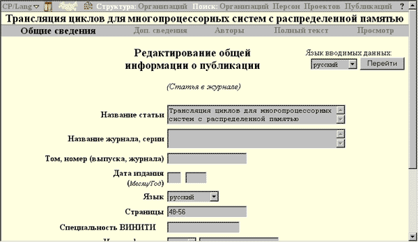 Этот раздел (Рис. 1) предназначен для редактирования общих сведений о публикации - названия, года издания, идентификатора ISSN и т.д., а также для удаления публикации. Поскольку в системе предусмотрено три типа публикация - статья в журнале, статья в трудах конференции и монография (книга) - то некоторые поля могут изменять свое назначение или вовсе отсутствовать для различных типов публикаций.