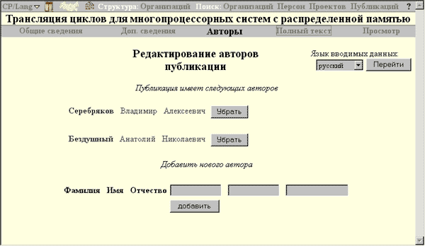 Третий раздел предназначен для редактирования списка авторов публикации (Рис. 1). В начале страницы перечисляются все авторы публикации с указанием фамилии, имени и отчества.