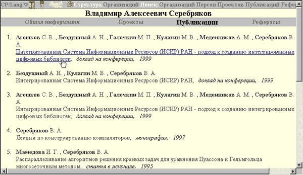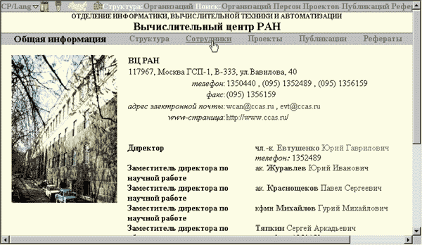Принцип взаимосвязи ресурсов получил свое отражение и в страницах ресурсов. Все страницы ресурсов связаны между собой с помощью гиперссылок. Например, найдя в системе интересующую Вас организацию, Вы можете нажатием на соответствующую закладку узнать список сотрудников этой организации (Рис. 1).