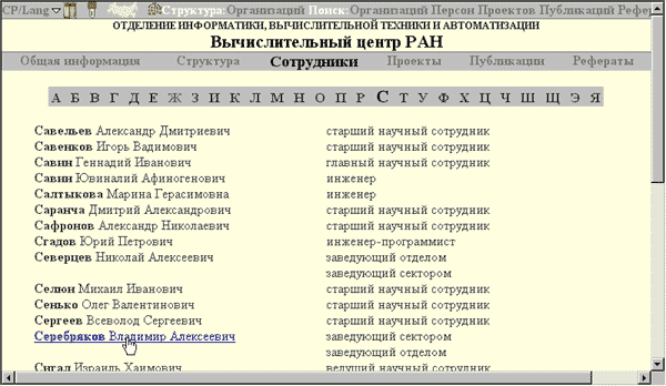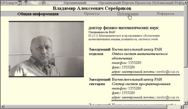 Имея такой список, Вы можете немедленно (простым нажатием мышки) выйти на персональную страничку интересующего Вас сотрудника (Рис. 2).