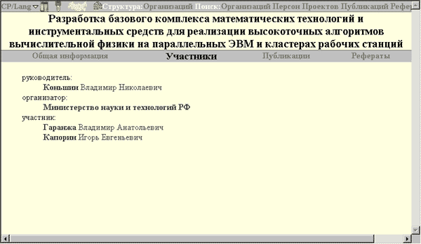 Второй раздел страницы проекта (Рис. 1) содержит информацию об участниках проекта. Информация представляется в виде списка с указанием имени каждого участника (со ссылкой на соответствующую страницу персоны) и его роли и функций в данном проекте.