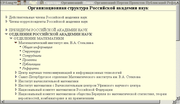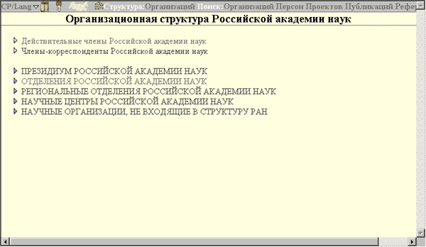 Элементы списка, отмеченные маркерами являются промежуточными узлами ветви и содержат в себе структурированную информацию. Например, нажатие гиперссылки узла "ОТДЕЛЕНИЯ РОССИЙСКОЙ АКАДЕМИИ НАУК" приводит к открытию списка отделений Российской Академии Наук (Рис. 4).